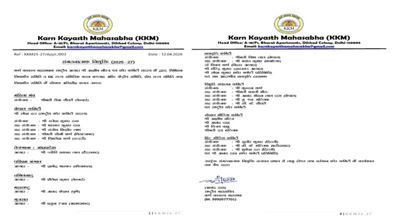 नई दिल्ली। कर्ण कायस्थ महासभा द्वारा 12 अप्रैल क’ अपन द्विवर्षीय संगठनात्मक नियुक्ति क’ दोसर चरण क’ घोषणा कएल गेल। ई जानकारी देत आशीष नीरज (राष्ट्रीय अध्यक्ष) आ आनंद दास (राष्ट्रीय महासचिव) कहलनि जे सभ नियुक्ति तत्काल प्रभाव स’ लागू होएत आ वर्तमान कोर कमिटी क’ कार्यकाल धरि मान्य रहत।