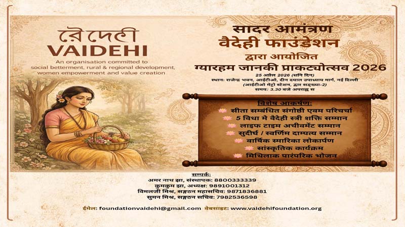नई दिल्ली। वैदेही फाउंडेशन द्वारा जानकी नवमी क’ अवसर पर ग्यारहम वार्षिक आयोजन ‘ग्यारहम जानकी प्राकट्योत्सव 2026’ एहि वर्ष वैशाख शुक्ल नवमी, 25 अप्रैल (शनिवार) के राजेन्द्र भवन सभागार, दीन दयाल उपाध्याय मार्ग, नई दिल्ली मे आयोजित कएल जाएत।